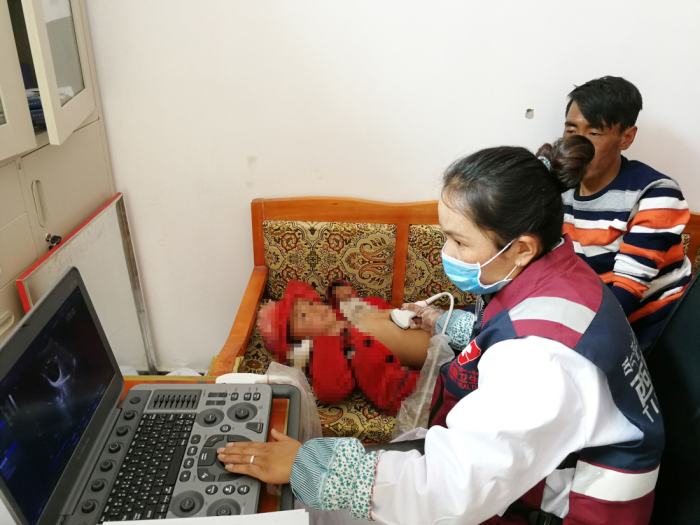 旺姆(化名),三歲,是同爸爸媽媽一起來的篩查中心,旺姆有一雙大大的眼睛,聲音非常甜美,看我在照相,害羞地往媽媽的背后躲,又好奇地探出小腦袋,非??蓯郏职謰寢岓w檢時她安靜地站在旁邊看,不哭不鬧,是個安靜的小寶寶,輪到小旺姆體檢時,爸爸把她放在床上,格桑拉吉讓她躺下,小旺姆乖乖地躺好任由探頭在她的小肚子上劃來劃去。突然格桑拉吉臉色沉重,從衣服包里掏出手機,開始拍B超機屏幕,我心里一緊,悄悄問她,她只是點頭,三歲的旺姆(化名)被診斷為疑似病例。